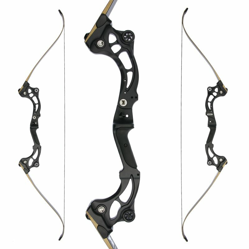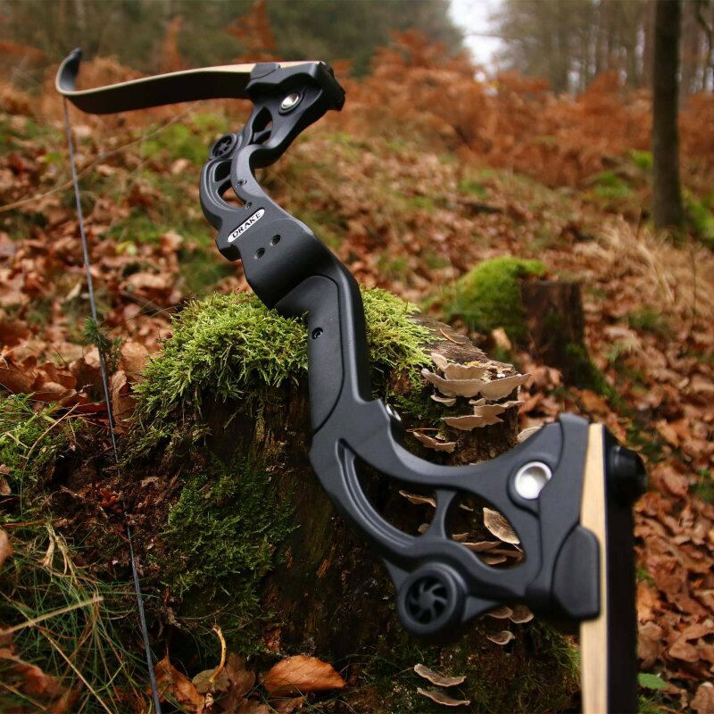 Made of a high-strength aluminium-magnesium alloy, the riser naturally has all the stabiliser, button and arrow rest bushings, as well as integrated damping elements. Due to the special shape of the riser, compound bow arrow rests are more suitable, as recurve bow arrow rests and buttons are too small or too short for the wide cut bow window. The limbs have a bamboo core and are covered with black fibreglass laminate.